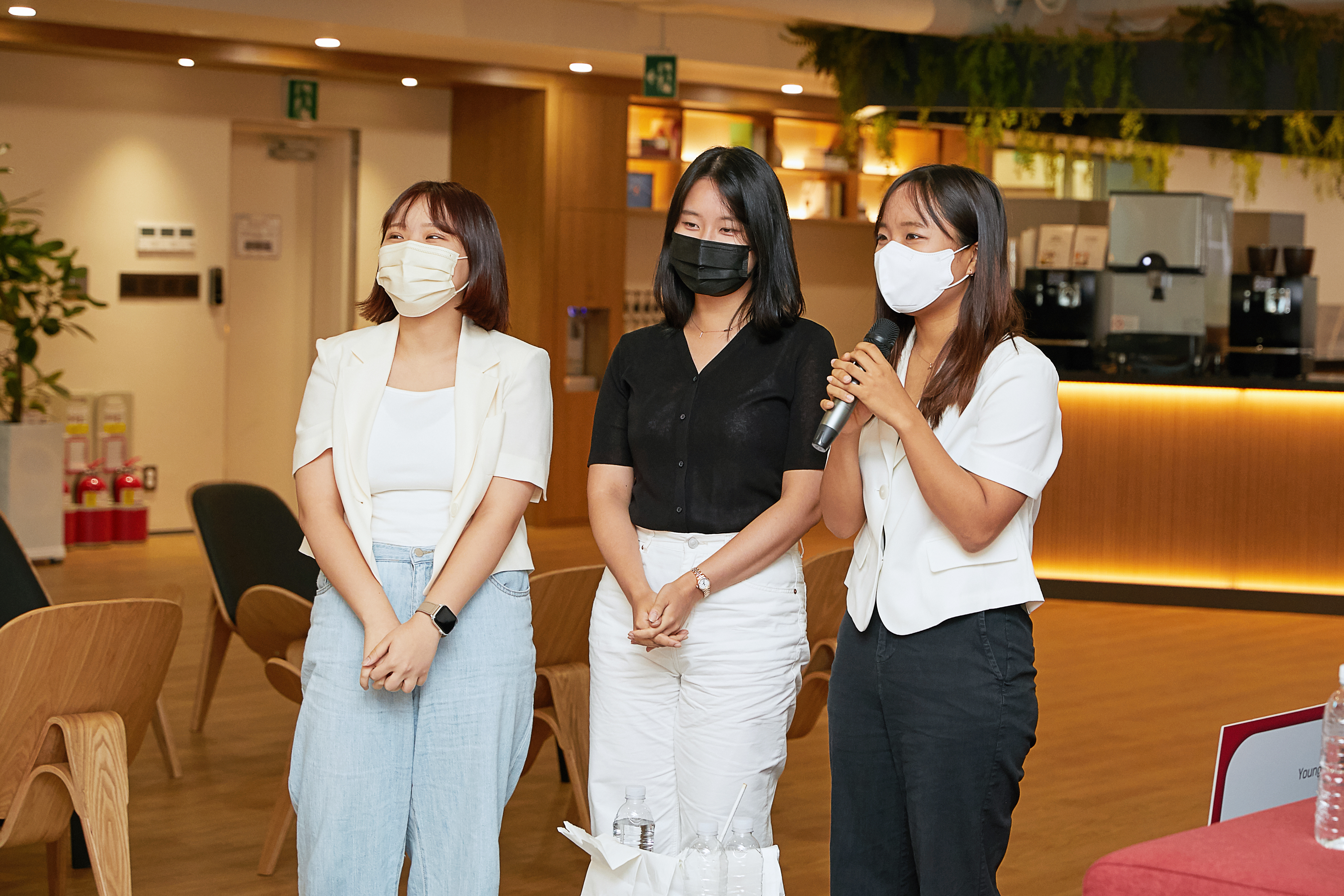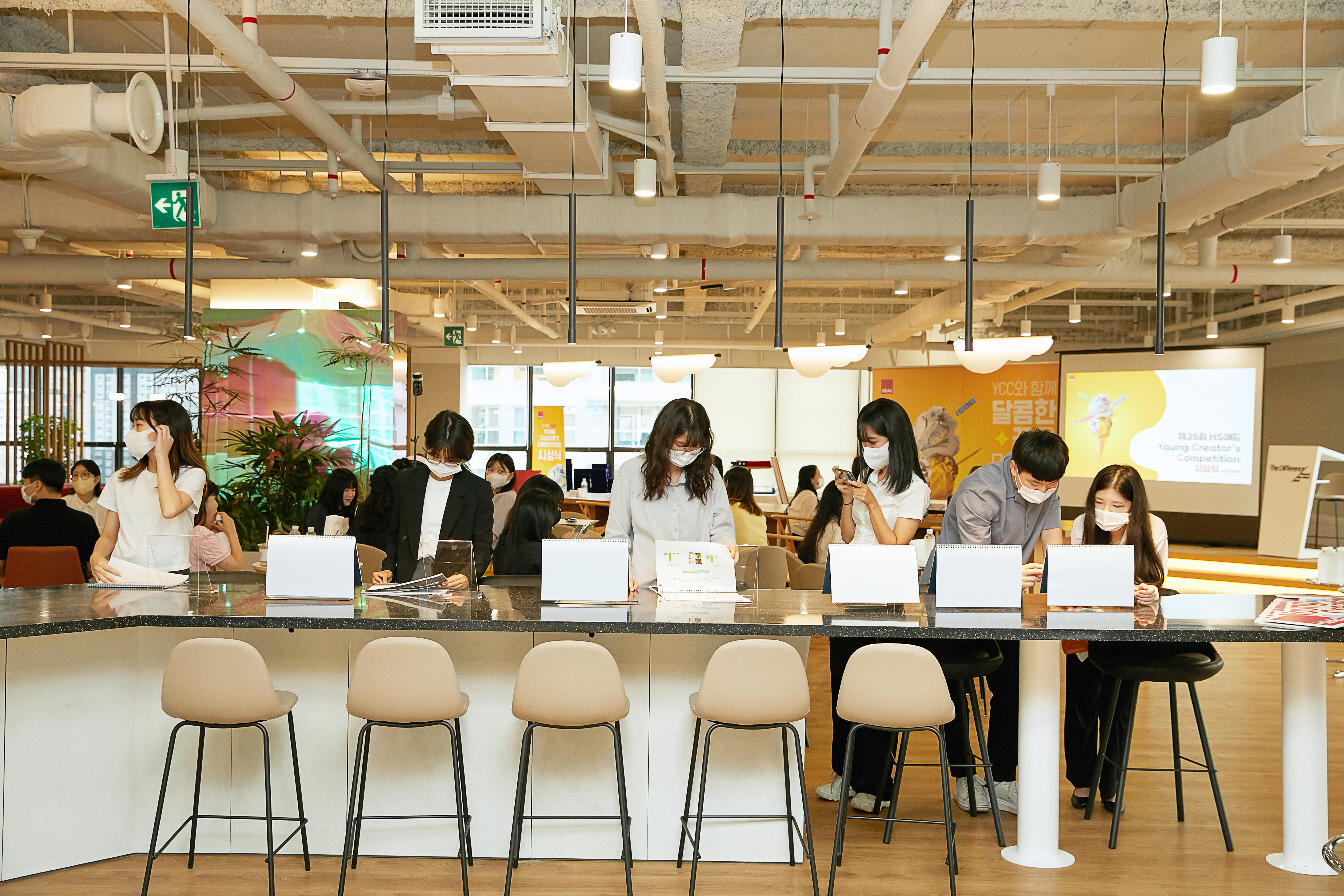 시상식은 HS애드 건물 15층에서 진행됐습니다. HS애드 15층은 넓고 쾌적한 공간으로, 다양한 회의실과 커피나 와인을 마시며 쉴 수 있는 쉼터로 구성되어 있어 직원들의 사랑을 듬뿍 받는 공간이라고 합니다. 이 날 15층 한편에는 공모전 수상자들을 위한 물과 간식도 준비되어 있었고, 카페테리아에서 커피도 자유롭게 이용할 수 있었습니다.
