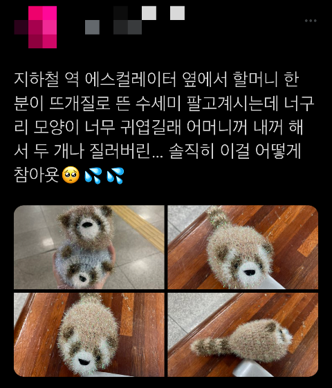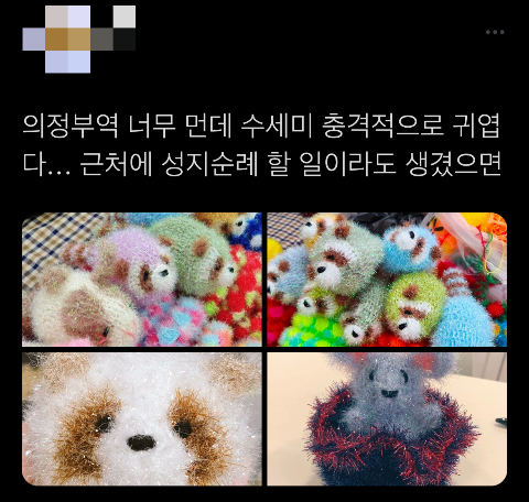 의정부역에서 한 할머니가 판매하시며 화제가 된 수세미 너구리! 복슬복슬한 털과 통통한 꼬리까지 너구리를 똑 닮은 모습으로 수세미로 사용하는 사람보다 집에 전시해두는 사람이 많다고 할 정도예요.
