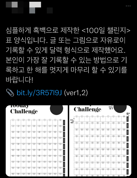 2022년이 100일 남은 지난 9월 23일을 기준으로, 한 가지 일을 정해 매일매일 하는 100일 챌린지가 유행 중이에요. 작고 사소한 일부터, 큰 목표를 세운 사람들까지 많은 사람들이 챌린지에 참여하고 있답니다. 사람들이 챌린지를 잊지 않고, 편하게 즐길 수 있도록 다양한 형식의 양식을 공유하는 사람도 있답니다!