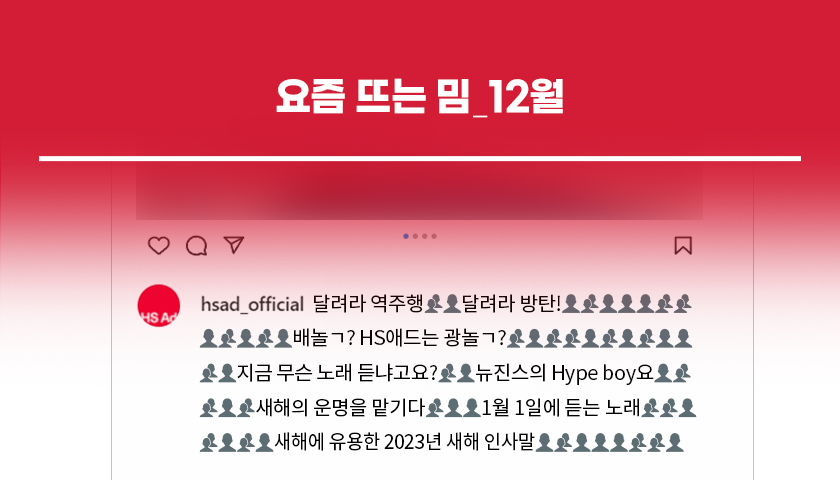| [월간 2023밈] 01월 편 - HS애드 광고 맛집으로 지명그! (0) | 2023.01.09 |