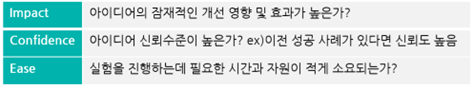 다양한 실험 아이디어를 검토하여 실험의 우선순위를 결정해야 합니다. 아이디어 검토는 ICE 3가지 요소를 기준으로 1~10점 척도로 평가하고 평균값으로 우선순위를 평가합니다. 점수는 실험 순위 결정에 가장 중요한 기준이 아니지만 객관적으로 아이디어를 검토할 수 있는 참고자료가 될 수 있습니다.