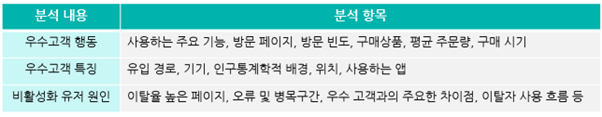 가장 많은 사용자를 획득한 주요 성과의 데이터에서 우수 고객 vs 비활성화 유저 그룹을 비교 분석합니다. 특히 우수 고객의 행동과 특징을 자세히 분석하고, 비활성화 유저 그룹의 원인을 파악하는 것이 주요 데이터 분석의 내용이 되어야 합니다.
