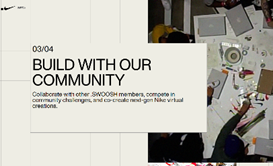 반 박자 빠르게 D2C로 전환하며 마케팅 환경에 따른 성공적 변화를 이어 온 나이키는 Web 3.0에 있어서도 앞선 움직임을 보이고 있습니다. 최근, 나이키는 ‘닷스우시(.swoosh)’라는 Web 3.0 기반 디지털 커뮤니티를 오픈했는데, 이 플랫폼을 통해 고객은 가상 디지털 자산(NFT의류)을 구매하고 거래할 수 있을 뿐 아니라, 나이키와 가상 제품을 공동 제작하고, 디자인에 대한 로열티를 받을 수 있습니다. 일반적 브랜드 사이트와 달리, 제품/콘텐츠의 생산과 유통 과정에 있어 탈 중앙화를 추구하는 닷스우시는 고객을 플랫폼의 중앙에 놓으면서 브랜드 충성도를 확고히 하는 효과를 낼 수 있을 것으로 기대됩니다.