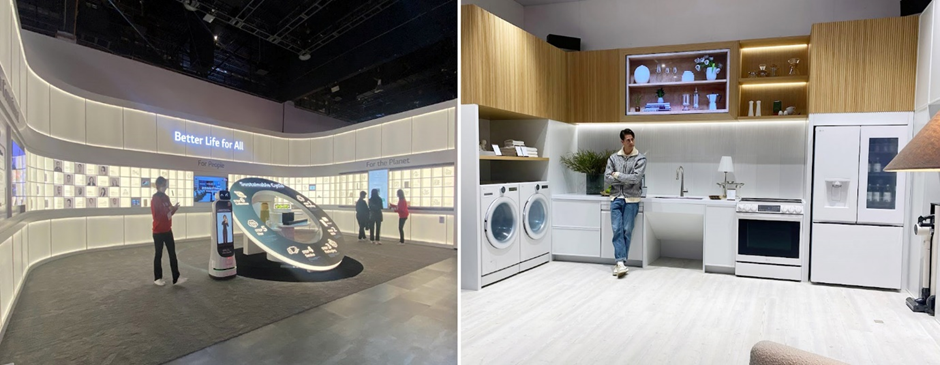 세계 최초로 연결선 없는 무선 OLED TV를 비롯하여, 컬러와 음악 체인지가 가능한 MoodUP 냉장고, 집에서 간편하게 근력 운동이 가능한 운동 기기, 사용자에 따라 화면 곡률이 조정 가능한 게이밍 스크린 등 일상의 경험을 업그레이드시켜주는 다양한 제품뿐만 아니라 차별화된 맞춤형 제어 및 가전 본연의 기능에 가치를 둔 UP가전의 허브 역할을 하는 ThinQ 체험까지, 다양한 경험이 가능한 전시 공간을 보여주었습니다.