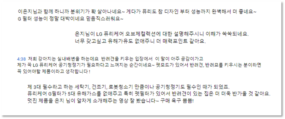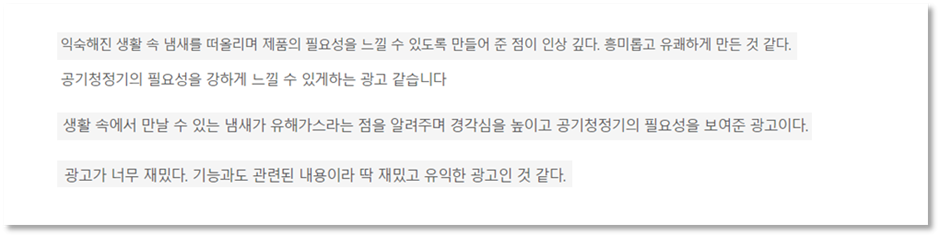 제품의 필요성이 와닿을 수 있었다는 평가와 반응들이 다수를 이뤄 캠페인을 통해 궁극적으로 만들어내고자 하였던 공기청정기의 새로운 기준과 구매 명분을 이끌어 낼 수 있었습니다. 이제 여러분도 공기청정기가 사계절 필수 가전이라는 것에 동의가 되셨나요?