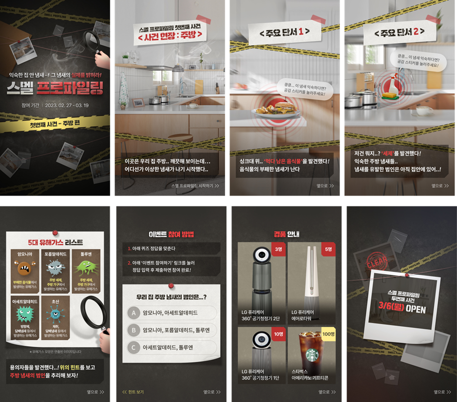 캠페인의 첫 번째 스텝으로 탈취기능에 대한 필요 인식 제고를 위해 집 안 내부의 위험을 알릴 수 있도록 ‘익숙한 냄새가 곧 유해가스’라는 신선한 충격을 던져 경각심을 높이고자 하였습니다. 이를 보다 리얼하고 신뢰도 있게 전달하기 위해 ‘냄새 민감도 실험’이라는 주제의 블라인드 테스트 형식을 빌린 반전 테스트모니얼 광고 영상으로 소비자들을 후킹 시킬 수 있는 메시지를 전달하고, 정보의 확산과 유해가스 학습을 위해 인스타그램의 스토리 기능을 활용한 유저 인터렉션형 소셜 이벤트를 병행하였습니다.