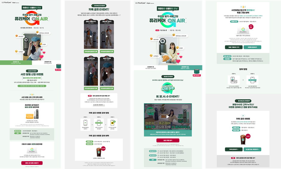 영상 콘텐츠를 보고 즉각적으로 구매 할인 혜택을 받을 수 있는 할인쿠폰 이벤트를 사전예약, 본방 이벤트로 2차에 걸쳐 진행하였습니다. 이벤트 기간 내 앞선 1,2단계의 광고영상 시청 유저와 LGE.COM의 퓨리케어 제품 관련 행동을 보였던 유저들의 1 stparty data부터 공기청정기 구매 고려군들의 외부 DMP data, 매체 data까지 데이터를 적극 활용한 타겟팅 세분화 광고전략으로 잠재고객 대상으로 제품 관여도와 구매 의향을 높이고 콘텐츠와 이벤트 간의 시너지가 발생될 수 있도록 하였습니다.