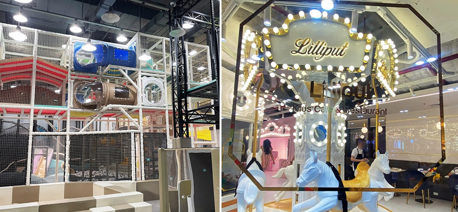 ▲ 9미터의 천장 높이에 300여 평으로 조성된 스포츠형 키즈 카페 '챔피언 1250' 주말의 경우 평균 800명의 어린이들이 찾는 아이들의 인기 명소입니다. (좌) / 식사와 놀이가 동시에 가능한 프리미엄 키즈 카페 브랜드로 유명한 릴리펏. 중국, 태국, 베트남에도 동일한 모델로 진출한 K-키즈카페의 대표주자입니다. (우)