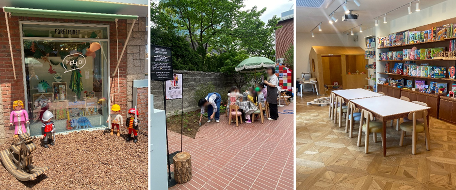키즈 산업의 성장세가 지속되는 시장 상황에 맞춰, 키즈 브랜드들의 스토어도 다양하게 전개되는 것을 확인할 수 있는데요. 최근 오프라인 공간의 대세인 복합문화공간 역시 키즈 브랜드 매장에 적극적으로 도입되고 있습니다. 국내외 감각적인 아동용 브랜드를 소개하는 편집샵 브랜드 포레포레의 플래그쉽스토어 또한 키즈 콘텐츠를 중심으로 한 복합 문화 공간을 잘 보여주고 있는데요, 프랑스어로 숲을 뜻하는 ‘포레(Foret)’를 뜻하는 포레포레는 작년에 서울숲과 인접한 빨간 벽돌 건물을 리모델링하여 오프라인 플래그쉽스토어를 선보였습니다.