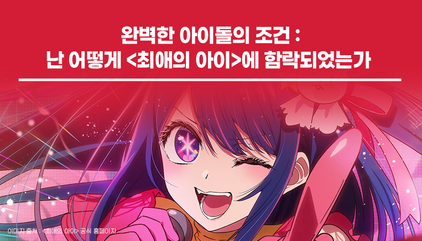 ‘않았습니다’라는 과거형 문장에서 이미 눈치채신 분들이 있겠죠? 23년 2분기에 글로벌에서 가장 히트한 작품, <최애의 아이>의 아이돌 캐릭터 ‘호시노 아이’에 의해 저는 드디어 함락당했습니다. 제 마지막 저항선이 함락되는 과정을 살펴보면서, 완벽한 아이돌이 갖춰야 할 조건은 무엇인지 알아보겠습니다.