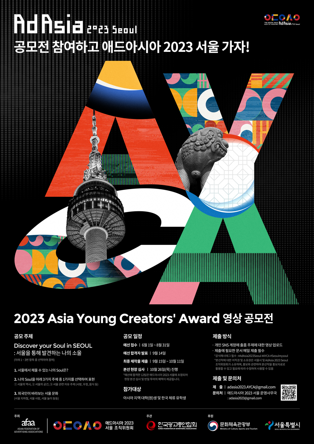 대한민국의 수도 '서울'의 도시 브랜딩을 위한 영상 제작 공모전 서울 도시브랜딩 아시아 대학생 공모저니(AYCA)의 예선 합격자 발표가 다가오고 있어요! 8월 31일까지 예선 접수가 진행되며 9월 14일 예선 합격자 발표 이후 9월 15일부터 10월 11일까지 최종 제작물 제출이 진행된다고 해요. 총 12팀을 시상할 예정이라고 하니, 영상과 브랜딩에 관심 있는 분들은 지금 바로 달려가세요!