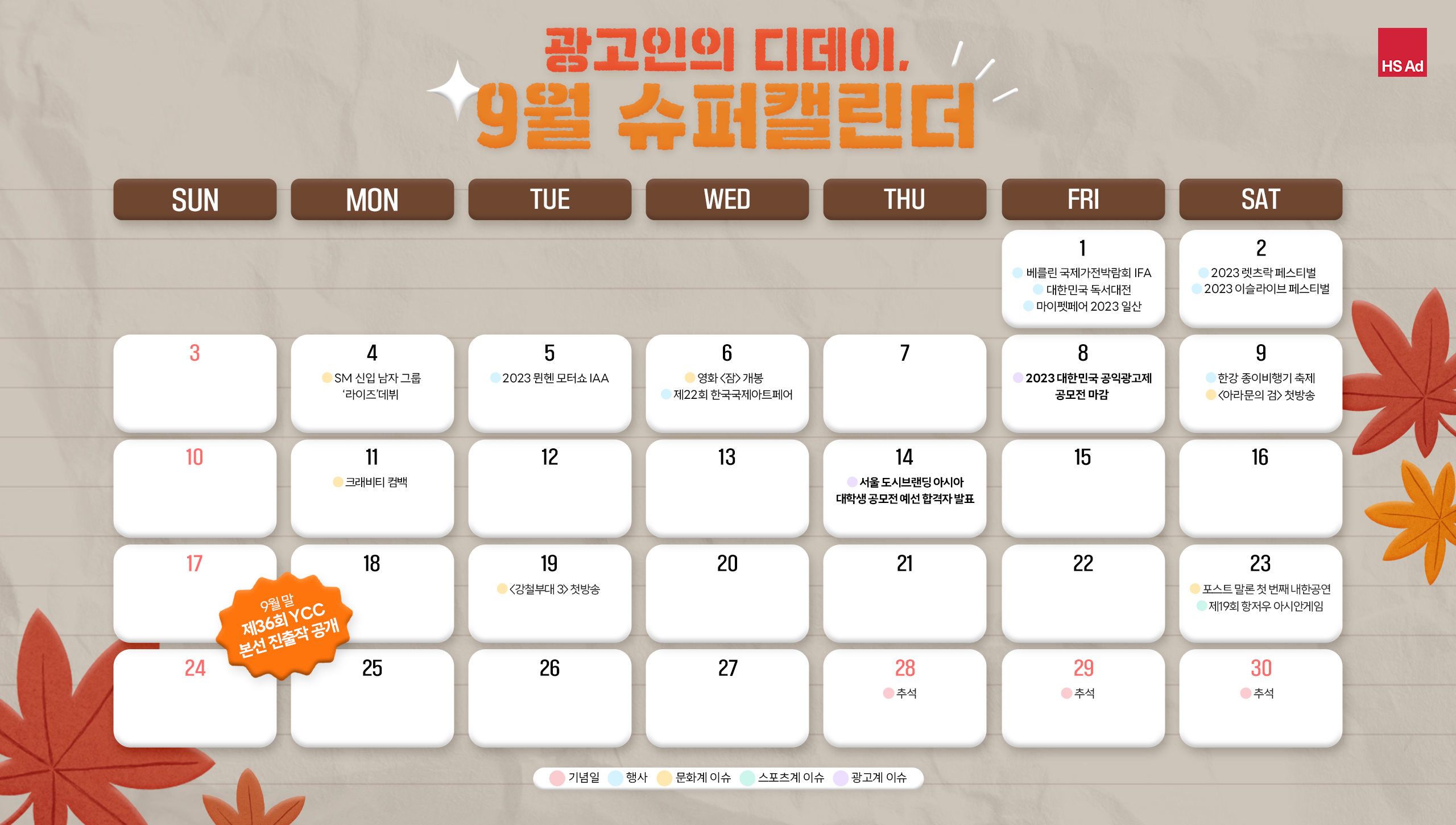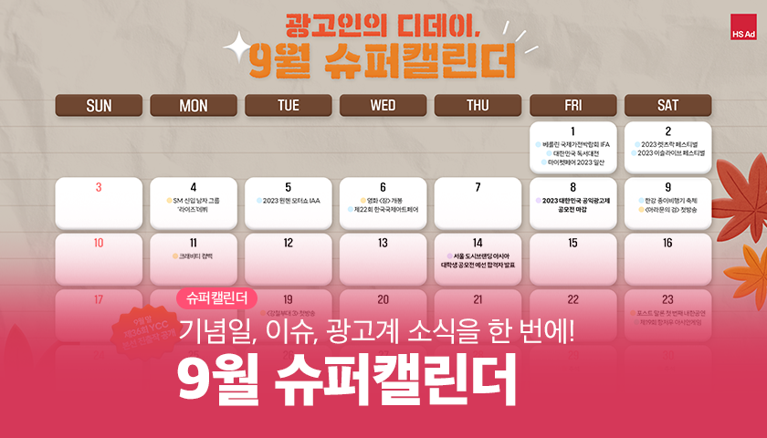 | [HS슈퍼캘린더] 광고인이라면 알아두어야 할 11월의 디데이💯 (0) | 2023.10.12 |
