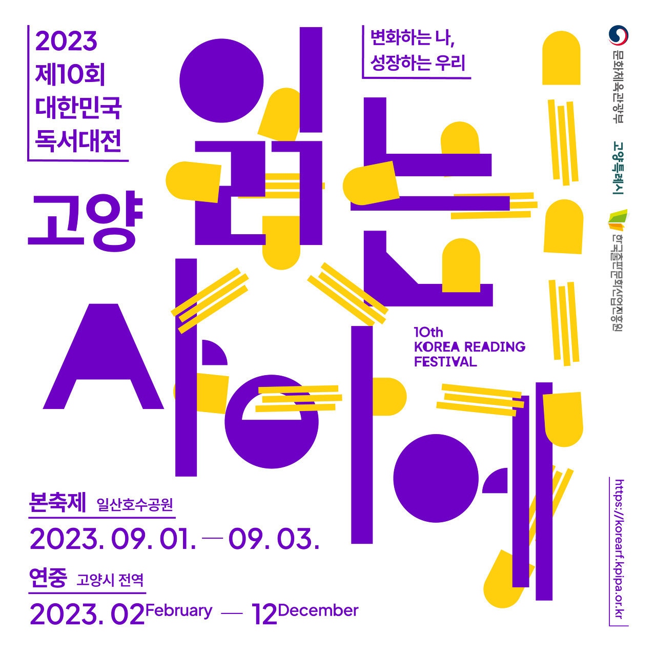 제10회 대한민국 독서대전이 고양시에서 개최예정이에요. 연중 프로그램은 올해 2월부터 12월까지 진행되지만 본 행사는 9월 1일부터 3일까지 사흘간만 진행 예정이에요. '읽는 사이에'라는 슬로건을 내세운 이번 독서대전은 책과 사람, 사람과 세상을 이어 함께 성장할 수 있는 책의 축제라고 해요. 고양시 일산호수공원 일원애서 진행되는 본 행사는 강연, 체험, 전시, 공연, 학술, 독서모임 그리고 챌린지까지 다양한 프로그램이 준비되어 있다고 해요. 책을 즐기고 책과 사랑에 빠지기 좋은 9월, 독서대전이 기대돼요.