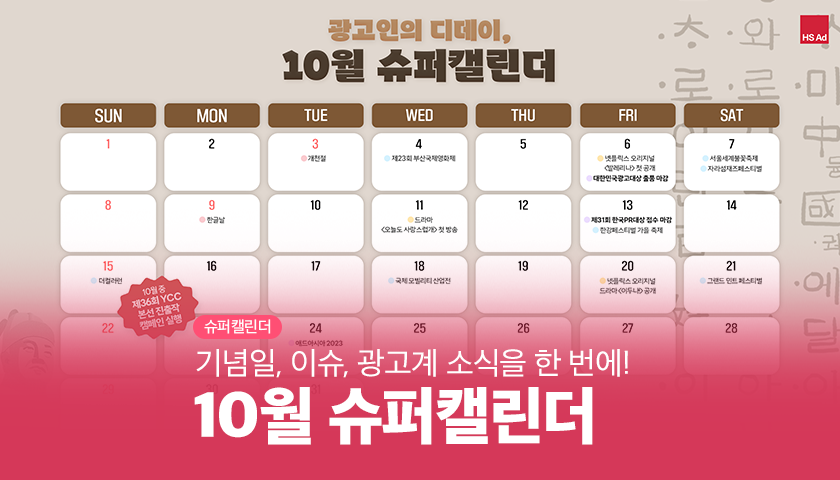 | [HS슈퍼캘린더] 광고인이라면 알아두어야 할 11월의 디데이💯 (0) | 2023.10.12 |