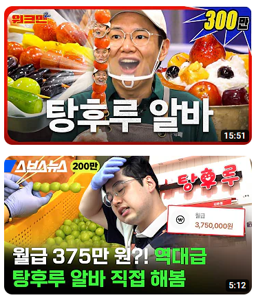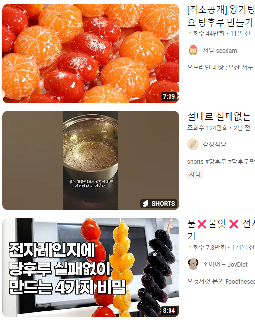 외에도 탕후루 알바 체험기, 탕후루 만들기 등의 유튜브 콘텐츠가 유행하고 있어요!