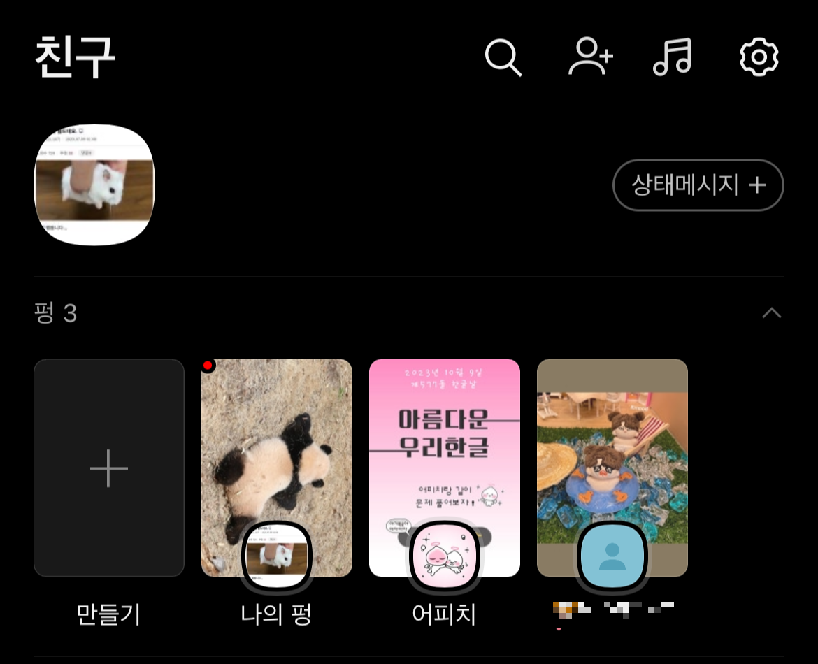 인스타그램 스토리와 다른 점은 펑을 누르지 않아도 게시물을 미리 볼 수 있다는 점! 귀여운 사진을 펑에 올려놓으면 카카오톡에 접속할 때마다 기분이 귀엽습니다😳
