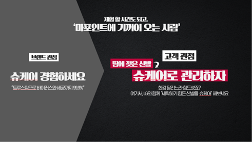 저희는 '누가 매일 세탁할 수 없는 신발을 손쉽게 케어받을 수 있는 슈케어 & 슈케이스 제품에 갖고 싶어 할까?'라는 질문을 던진 후 신발을 좋아하는, 신발을 아끼는 누군가를 타겟팅해야 했습니다. 많은 고민 끝에 한 켤레의 운동화만 있으면 특별한 제약 없이 즐길 수 있는 스포츠 러닝이 요즘 트렌드가 되어 많은 MZ세대가 즐기고 있는데, 이 러너들을 타겟팅해야겠다고 생각했습니다. 기꺼이 저희가 준비한 경험공간이 찾아오는 타겟, 바로 MZ세대 러너분들이었습니다.