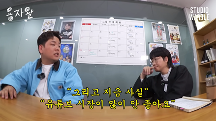 얼마 전 개그맨 이용진이 진행하는 [용자왈]에서 게스트로 유튜버 곽튜브가 출연한 편을 봤다. 거기서 곽튜브와 이용진이 나누는 대화가 흥미로웠다. "유튜브 시장이 많이 안 좋다." "조만간 방송계에 먹힐 것이다."