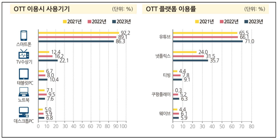 다만 확실한 것은, OTT나 유튜브가 지상파나 다른 케이블 채널만큼 접근성이 높아지고 있다는 점이다. 멤버십 가입이라는 벽은 아직 있으나, 매년 디지털 콘텐츠 지불금액은 상승하고 있으며 2030은 유료 이용률이 50%를 돌파했다(하기 그래프 참고). 또, 올해 상반기에 최초로 글로벌 TV 시장에서 스마트 TV 출하량 비중이 90%를 돌파했다고 한다.[2]