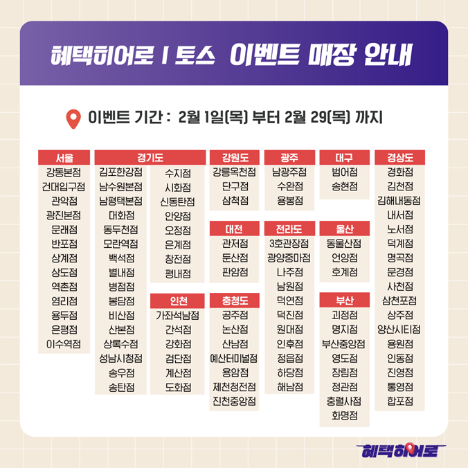 토스의 함께 토스 켜기 2배 이벤트가 함께 열리는 특정 날은 더 많은 사람들이 매장에 들어와 체험을 하고, 상시로 열려있는 매장체험 리워드로는 최대 2,000원의 토스포인트 혜택을 받고 있습니다.(한 매장당 2배 이벤트는 월 2회 적용 + 혜택히어로 매장체험 이벤트는 매일 상시 운영)
