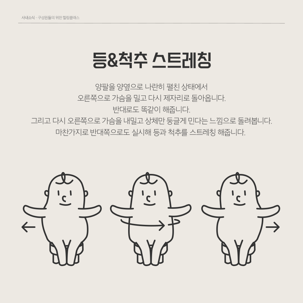 허리 스트레칭부터, 목, 등 그리고 척추 스트레칭까지 알차게 배워보았는데요! 지금 이 글을 보고 계시는 여러분도 손 머리 위로 좌우로 흔들흔들~ 골반도 들고 좌우로 흔들흔들~