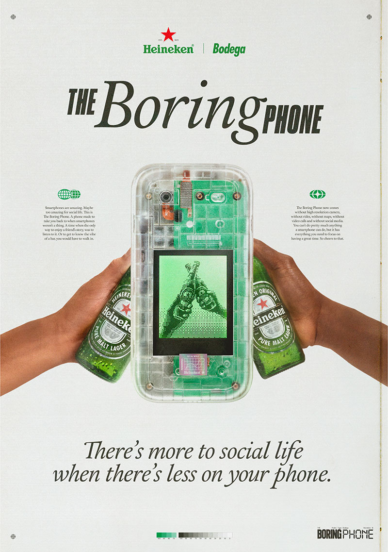 하이네켄은 늘 오프라인에서 사람들과의 교감을 중요하게 생각합니다. 하지만 마주 앉아 있어도 각자 스마트폰을 들여다보기 일쑤죠. 그래서 생각지 못한 제품을 만들었습니다. 오직 마주 앉은 상대방에게만 관심을 가질 수 있도록, ‘Boring phone'을 선보였습니다. 오직 통화와 문자만 가능하고, 사진을 찍을 순 있으나 저화질로만 찍히며 간단한 구식 게임을 즐길 수 있을 뿐입니다. 어떤 앱도 깔 수 없으며 인터넷에 연결되지도 않습니다.