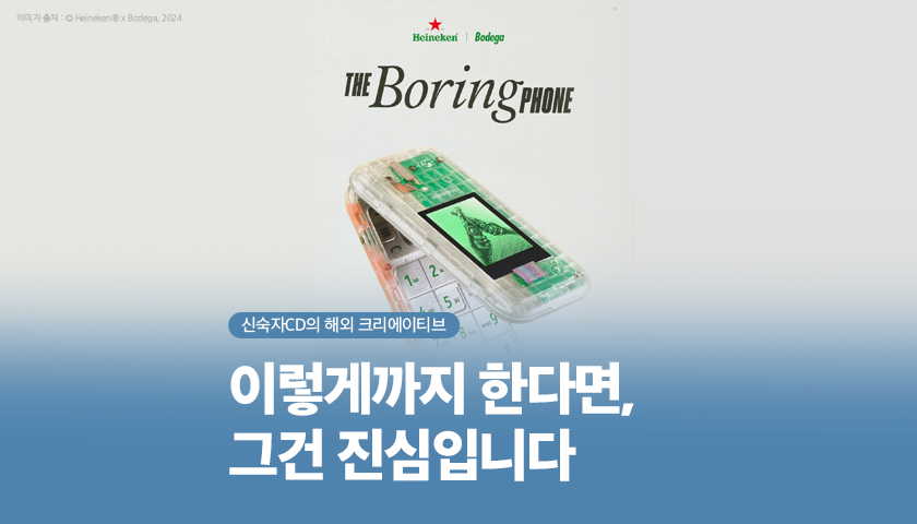 하이네켄은 늘 오프라인에서 사람들과의 교감을 중요하게 생각합니다. 하지만 마주 앉아 있어도 각자 스마트폰을 들여다보기 일쑤죠. 그래서 생각지 못한 제품을 만들었습니다. 오직 마주 앉은 상대방에게만 관심을 가질 수 있도록, ‘Boring phone'을 선보였습니다. 오직 통화와 문자만 가능하고, 사진을 찍을 순 있으나 저화질로만 찍히며 간단한 구식 게임을 즐길 수 있을 뿐입니다. 어떤 앱도 깔 수 없으며 인터넷에 연결되지도 않습니다.