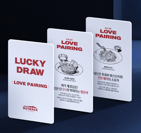 그래서 ‘아웃백에서 경험할 수 있는 문화가 뭔데?’라고 질문했을 때 이를 정의할 수 있는 한마디가 필요했습니다. 페어링을 통해 수많은 스토리를 펼칠 수 있는 공간, 아웃백을 임팩트 있게 전달하는 키카피 ‘LOVE PAIRING’이 그렇게 탄생하였습니다.