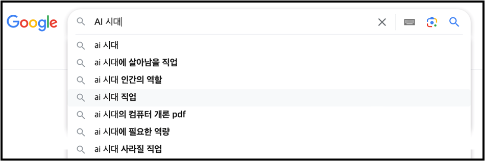 AI로 인한 변화 중 가장 불안한 것은 당연하게도 당신들의 ‘현업의 변화’ 일 것이다. 당장 구글에 ‘AI 시대’를 검색해 봐도 아래 이미지처럼 연관검색어가 나오는 것을 확인할 수 있다.