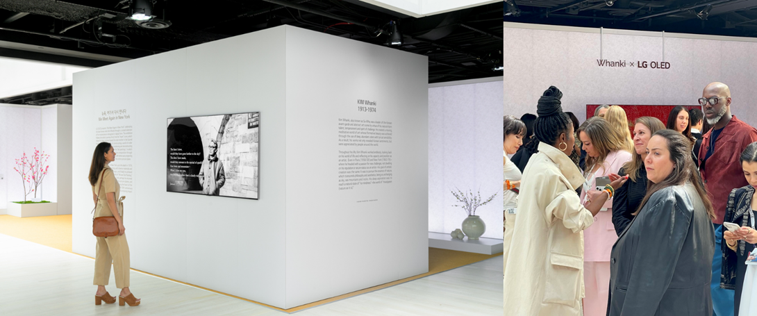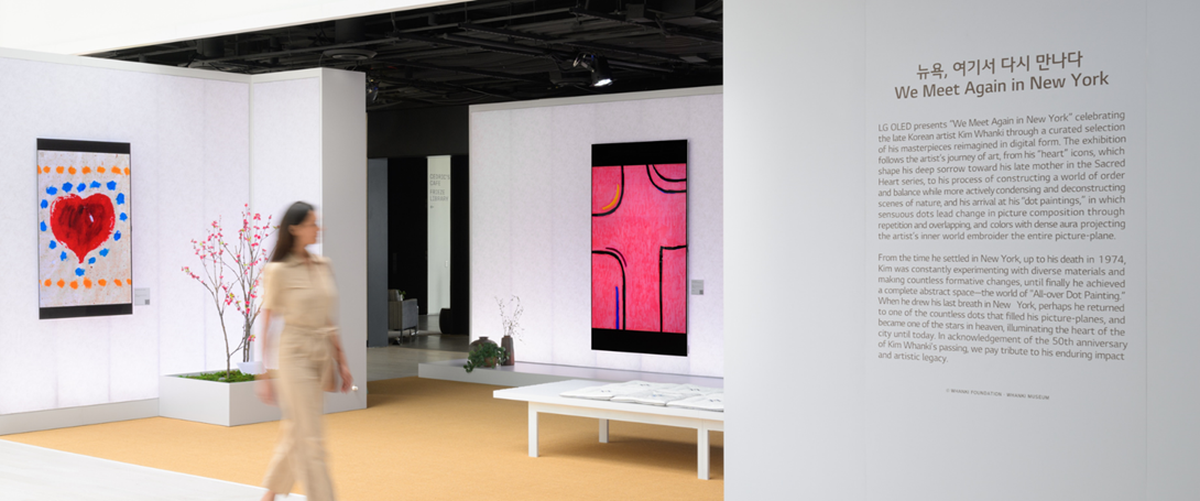 프리즈 로스앤젤레스에 이어 5월에 열린 프리즈 뉴욕에서는 추상미술의 거장 故 김환기 화백의 작품을 미디어아트로 재해석한 전시 ‘뉴욕, 여기서 다시 만나다(We Meet Again in New York)’을 선보였습니다. 작년 프리즈 서울에서 김환기의 레거시를 이어 나가기 위한 후배 미디어 아티스트들이 LG OLED를 캔버스로 활용해 작업한 작품들을 처음 선보여 국내외 아트 피플에게 강렬한 인상을 남겼던 ‘서울, 여기서 다시 만나다’의 뉴욕 버전으로 기획하였는데요. 이번 라운지를 통해, 뉴욕 아트 피플에게도 김환기를 다양한 관점으로 바라보고 보다 깊이 있게 이해할 수 있는 토대를 제공했습니다.