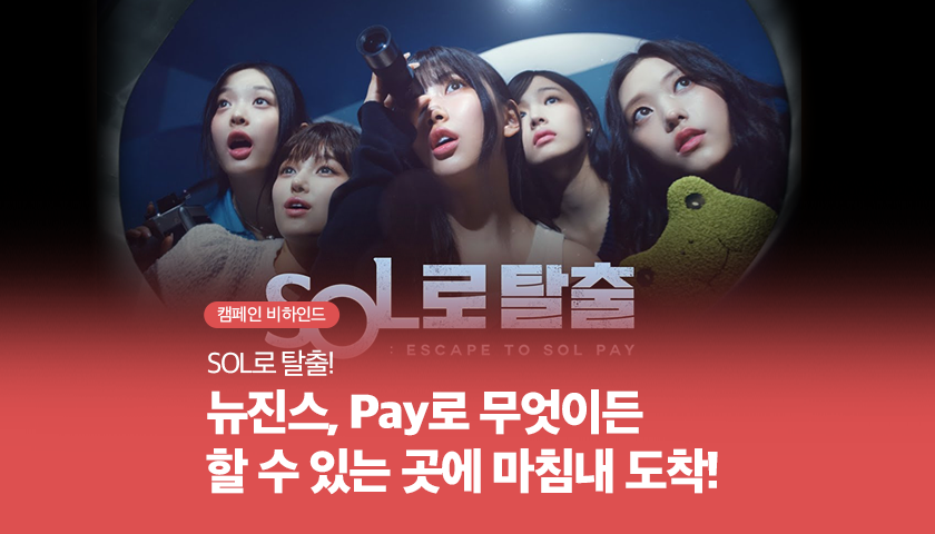 이번 캠페인은 신한카드의 새로운 모델 뉴진스와 함께 진행하였습니다. ‘SOL로 탈출’이라는 콘셉트 하에 기획된 이번 캠페인은 복잡한 페이 세상에서 신한SOL페이의 편리한 세상으로 떠나는 뉴진스의 모습을 보여줍니다. 특히 영상 중간에 뉴진스 멤버들은 망원경을 통해 SOL페이 세상을 보게 되는데요.