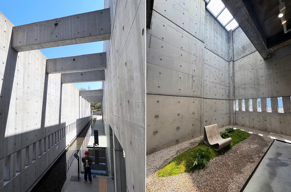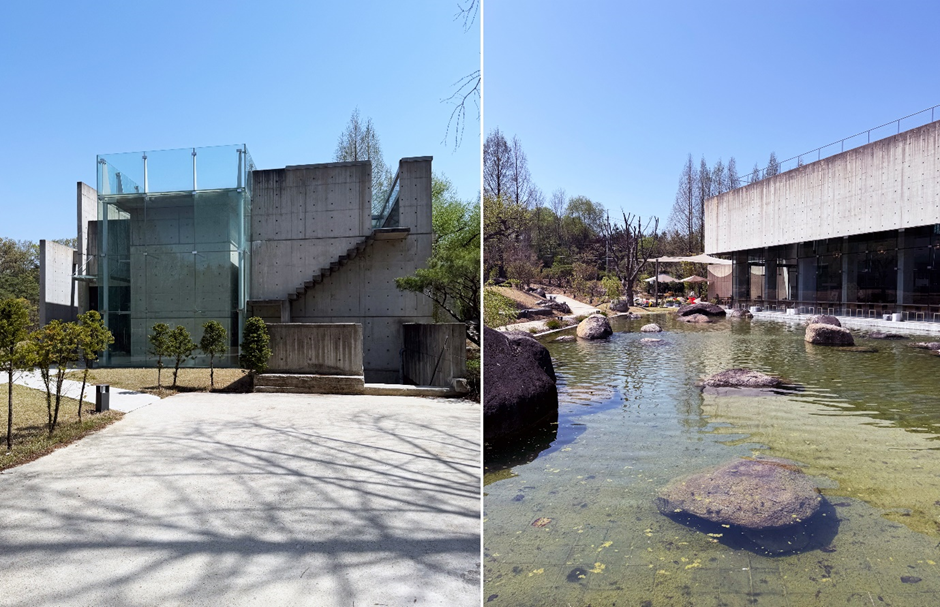 다양한 문화적 시도를 하고 있는 열린 공간을 표방하면서 전시 공간 외에 카페, 레지던시 등 8개의 독특한 건물로 이루어져 있는데요. 캠퍼스를 이루는 모든 건축물에 노출 콘크리트 소재를 사용하여 통일감과 함께 복잡한 장식과 불필요한 요소를 배제, 형태와 기능에만 집중할 수 있도록 설계되어 있습니다. 특히 건물과 건물 사이를 수목과 연못으로 연결하여 자연과의 조화도 신경 쓴 장소인데요. 넓은 대지를 연결하는 건물들과 이를 이어주는 초록의 자연이 강한 햇빛을 만나 다채로운 이미지를 유기적으로 만들어내기에 시간을 들여 오래 머물며 즐길 수 있는 공간입니다.