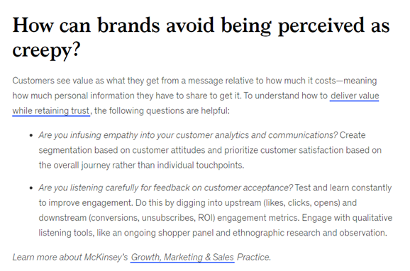 다만, 초개인화 마케팅을 강조하는 또 다른 회사인 맥킨지(McKinsey)가 이를 잘할 수 있는 방법을 다루면서도 강조하는 것이 있는데 이러한 소비자에 대한 관심이 ‘음흉해(Creepy)’보여선 안 된다는 점이다.[5] 이미 사람들은 구글이나 카카오톡 등을 이용할 때 자동으로 관심사에 맞춰 생성되는 광고물들을 보고 당황하고는 하는데, 만약 광고의 카피까지 너무 사생활에 밀접하게 접근한다면 거부감이 들 것이다. 국내에서 AI를 이용한 광고 형태를 개발하는 데 아직 미지근한 이유도 이 때문이라고 추측한다.[6]