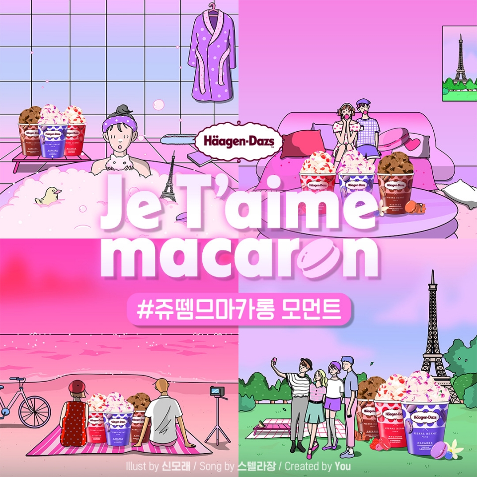 스텔라장 님의 대표곡 중 하나인 L'amour Les baguettes Paris를 일부 개사하여 캠페인 송을 만들었습니다. 곡 중에 등장하는 ‘바게트’를 이번 신제품의 키팩트인 ‘마카롱’으로 변경하고 하겐다즈의 브랜드명을 전면에 내세웠습니다.