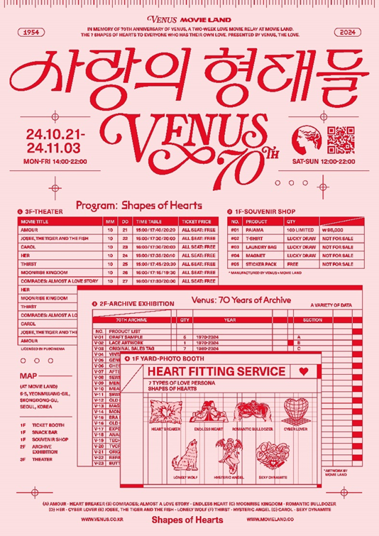 무비랜드라는 공간 특성을 고려하여 감성적 키워드를 고른 것도 있었다. ‘Heart(사랑)’는 사랑 영화로 이어졌고 결과적으로 70주년을 기념한 7개의 사랑 영화를 상영하게 되었다. 다양한 가슴의 형태도 커버하는 비너스로서 다양한 ‘사랑의 형태’를 보여줄 7개의 사랑 영화를 골랐고, 어린아이의 사랑부터 노년의 사랑까지 실제로 다양한 대상들의 사랑을 보여주고자 했다. 그리고 7개의 영화는 7개의 ‘페르소나’로 재해석되어 비너스의 헤리티지에 녹아들었다.