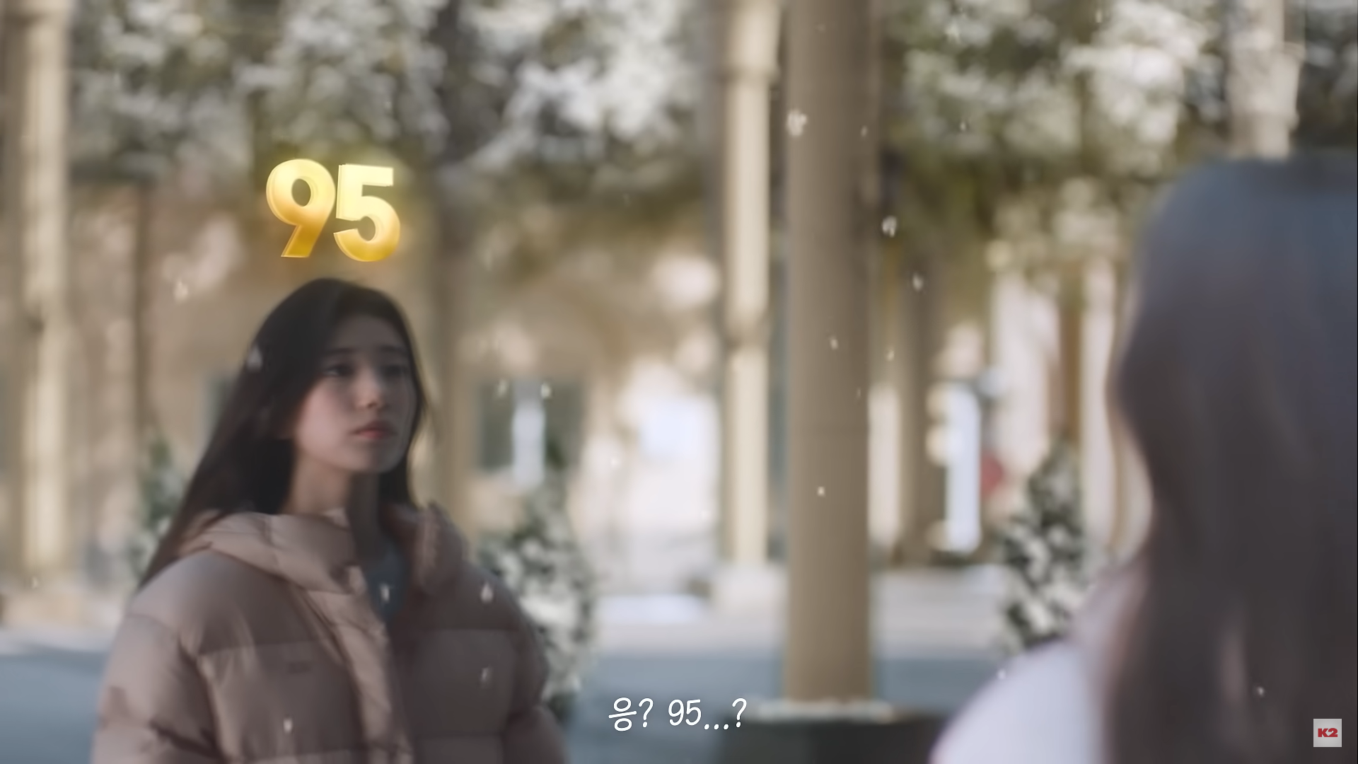 이 숫자의 진실은 바로 내가 입은 패딩의 솜털 비율! 95%의 솜털 비율을 가진 골든K95를 입은 수지의 머리 위에만 황금빛의 95가 떠 있습니다!