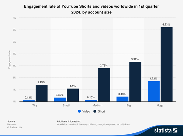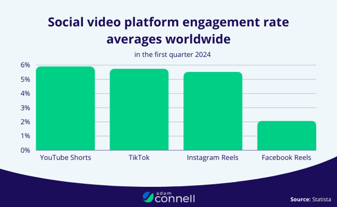 동영상이 다른 형태의 콘텐츠에 비해 참여도가 높은 편이지만, 그중에서도 유튜브 쇼츠의 평균 참여율은 5.91%로 틱톡의 5.75%, 인스타그램 릴스의 5.53%, 페이스북 릴스의 2.07% 등 모든 경쟁 플랫폼보다 높습니다.