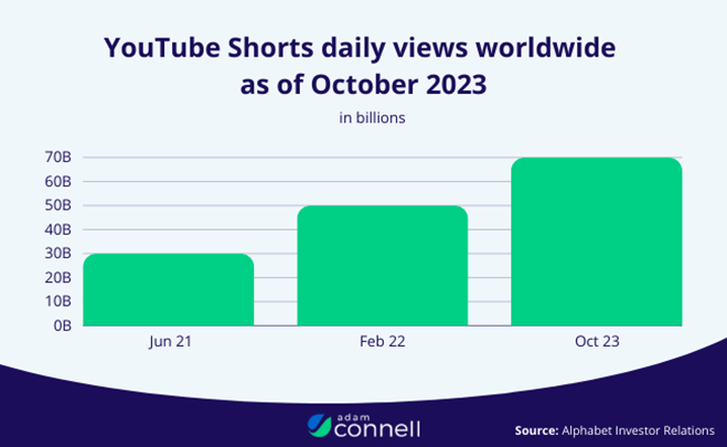 YouTube Shorts는 YouTube라는 거대한 생태계의 일부라는 장점을 가지고 있습니다. 게다가 유튜브 쇼츠의 인기가 워낙 높아 Financial Times에 따르면, 고위 직원들이 쇼츠가 ‘기존 유튜브 비즈니스를 잠식할 수 있다’고 경고할 정도입니다. 실제로 유튜브 쇼츠는 총합으로 하루 평균 700억 회 이상의 조회수를 기록하고 있습니다. 2024년 1분기 구글 실적 발표에 따르면, 유튜브 쇼츠 동영상의 하루 평균 조회수가 700억 회를 넘어섰다고 합니다. 이를 숫자적으로 생각해 봅시다. 각 동영상이 30초 길이라고 가정한다면 이는 하루에 약 2.1조 분의 유튜브 시청 시간을 의미하며, 이는 거의 400만 년에 해당합니다.