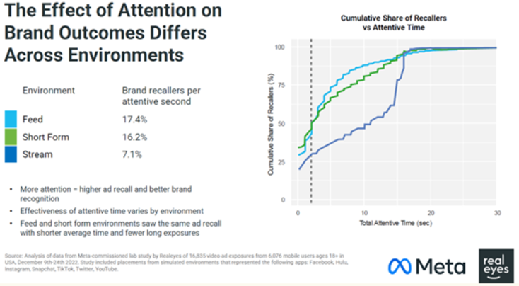 분석 결과, 스트림 환경에서의 광고가 전체적인 주목도 측면에서 가장 높은 점수를 기록했습니다. 그러나 "주목된 초당 브랜드 회상률(Brand recallers per attentive second)"을 기준으로 보면, 피드 환경의 광고가 가장 뛰어난 결과를 보였으며, 숏폼 환경의 광고가 그 뒤를 바짝 따랐습니다. 이 두 환경은 스트림 환경의 광고에 비해 훨씬 높은 브랜드 회상 효과를 나타냈습니다.