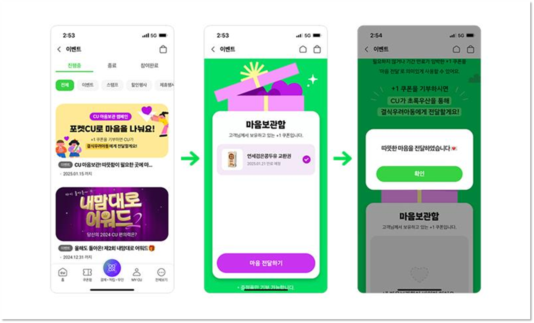 우리는 기나긴 CU편의점 측과의 기나긴 협의 끝에 1+1 상품 중 하나를 킵 해주는 App(포켓 CU)을 아주 조금만 손보기로 했습니다. “+1 상품을 나중에 수령할 수 있거나 or +1 상품을 지금 바로 결식아동들에게 후원해 주거나” 둘 중 하나를 선택할 수 있게 말이죠. 그리하여 시작된 캠페인의 이름이 바로 ‘CU마음보관’