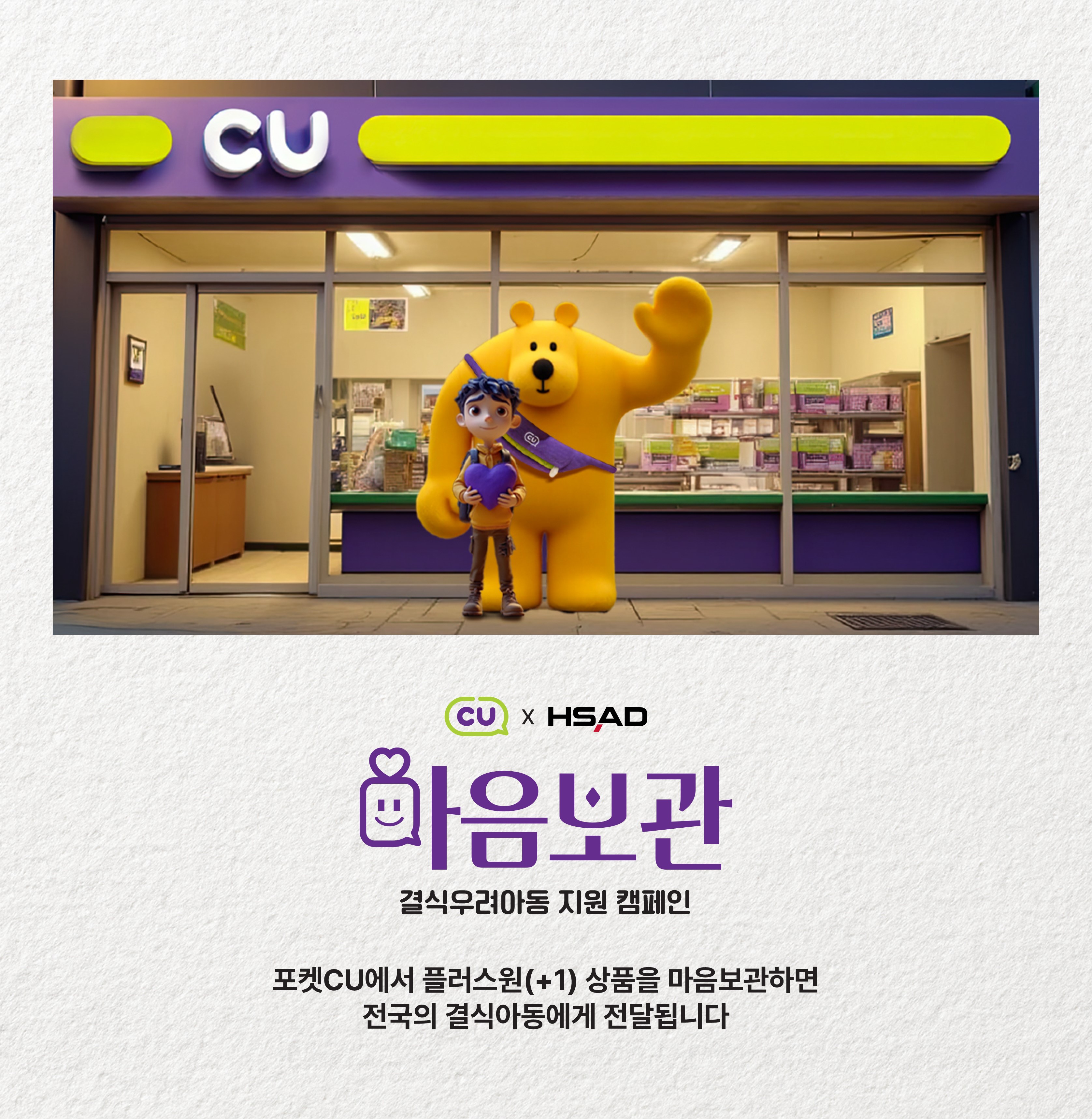 BGF리테일의 편의점 브랜드 CU와 HSAD가 함께한 ‘CU 마음보관 캠페인’이 최근 성공리에 종료됐습니다. ‘CU 마음보관’은 고객이 포켓CU 앱 내 마음 보관함에 저장된 +1 상품 쿠폰을 기부하면 CU가 일정 금액으로 환산해 결식 우려 아동들에게 전달하는 캠페인으로, 캠페인 기간 동안 모인 쿠폰과 금액은 기부되는 캠페인입니다.