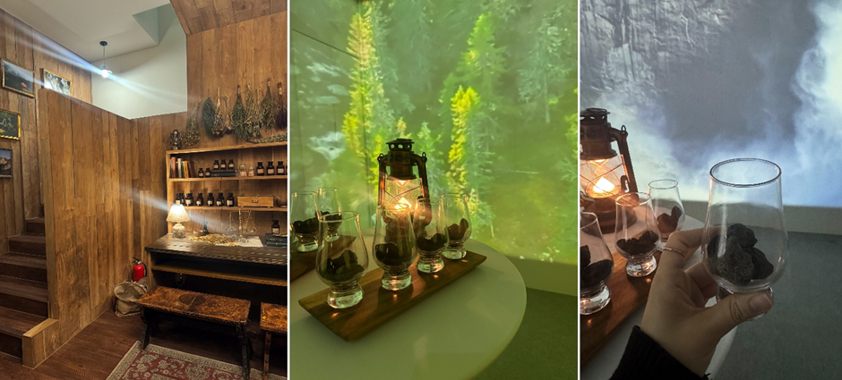 클래스 마스터의 안내로 시작된 프로그램의 처음은 헤이즐넛향이 가득한 조향사들의 작업이 이루어지는 산장에서 시작됩니다. 이곳에서는 공간에 펼쳐지는 영상과 함께 제품의 원재료를 상상하며 각기 다른 스토리의 향들을 체험하게 됩니다. 다음으론 3층으로 이동해 개개인에게 맞춤으로 준비된 상자를 받아 보게 되는데요. 사전에 넣은 정보를 토대로 별자리에 맞춰 블렌딩된 시향지를 통해 재미와 감동을 선사받게 됩니다.