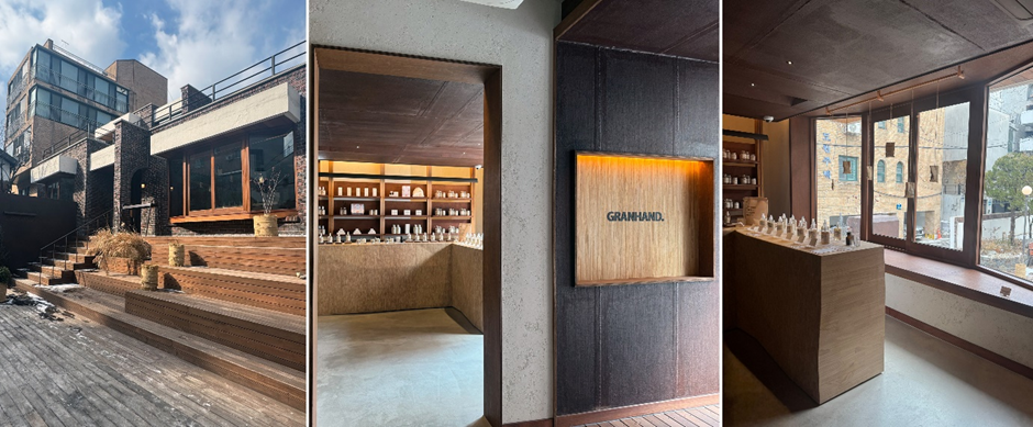 기억에 남는 향은 소장 욕구를 자극합니다. 굳이 필요하지 않더라도 나를 위한 작은 사치로 사고 싶기도 하고 사랑하는 사람들을 위해 선물하고 싶기도 하죠. 사실 향 제품들은 직접 체험해 보는게 중요하지만 필수품은 아니기에 단순히 제품을 전시하는 공간만으로는 재방문을 유도하기 힘들긴 합니다. 그렇기에 요새 트렌드에 맞춰 다양한 운영 프로그램을 도입하기도 하고, F&B 협업을 통해 복합 기능으로 구축하기도 하는데요. '향의 일상화'를 모토로 삼아 브랜드를 전개하고 있는 국내 향수 브랜드 그랑핸드는 브랜드 아이디덴티를 느낄 수 있는 플래그쉽 공간을 카페 브랜드인 콤포타블과 함께 서교동에 오픈하였습니다.