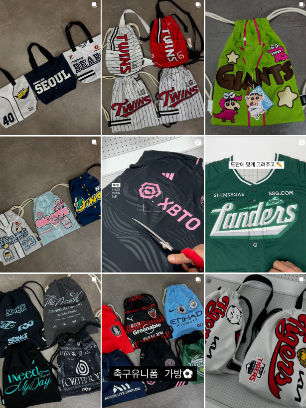 좋아하는 선수의 유니폼이나 구단의 굿즈를 가지고 직관 가방을 제작하는 경우도 많아요. 유니폼을 활용해서 주로 '짐색'을 제작하는 경우가 많은데요(물론 다른 종류의 가방으로 제작하기도 해요!). 좋아하는 선수의 유니폼으로 제작하는 경우가 많으며, 구단마다 다양한 캐릭터와 콜라보하여 나온 '콜라보 유니폼'으로 가방을 만들어 귀여움을 더하는 경우도 있어요!