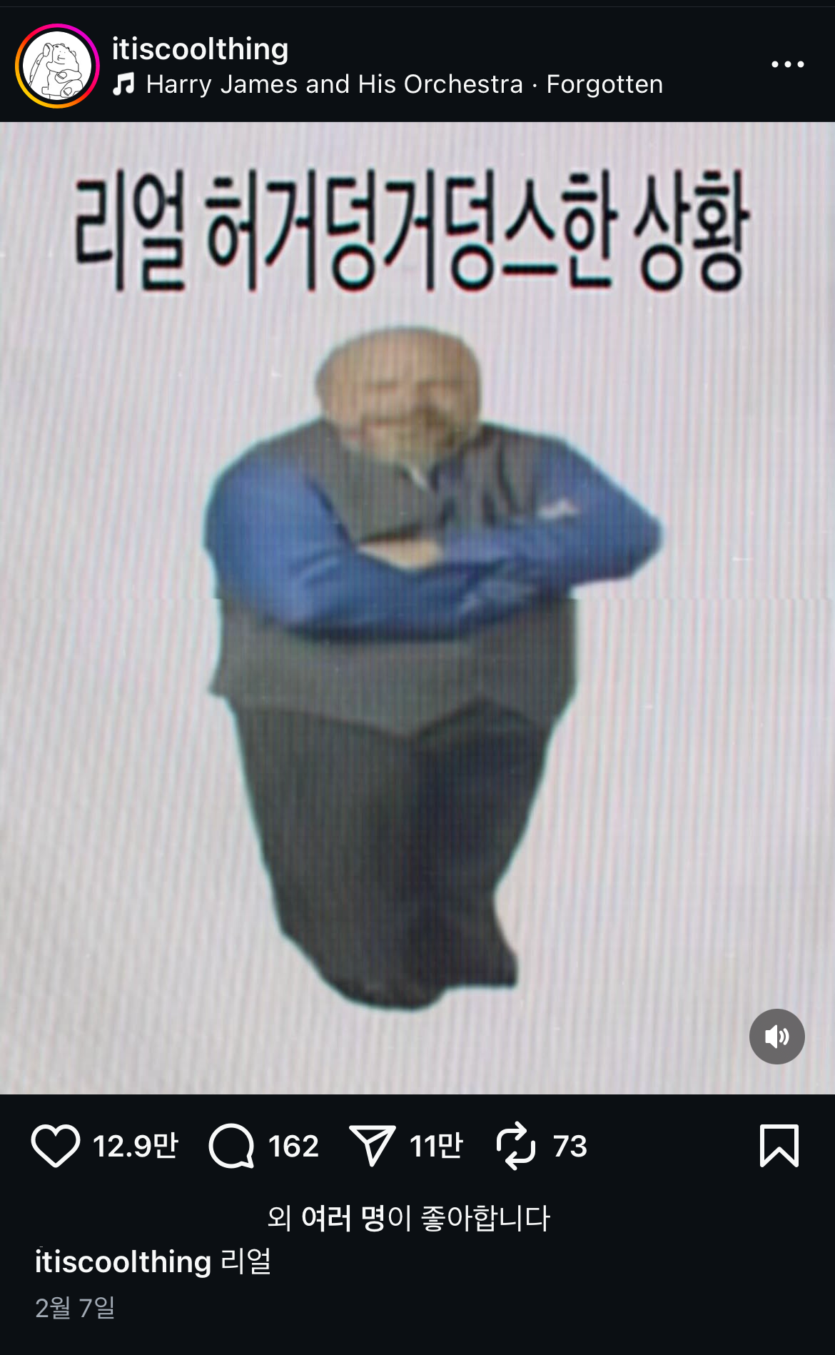 인스타그램에 올라온 하나의 게시물. 팔짱을 끼고 있는 외국인 남성의 이미지 위에 리얼 허거덩거덩스한 상황이라는 문구가 쓰인 게시물인데요. 해당 게시물은 국내에서 큰 화제가 되며 25년 초를 대표하는 밈이 되었어요.