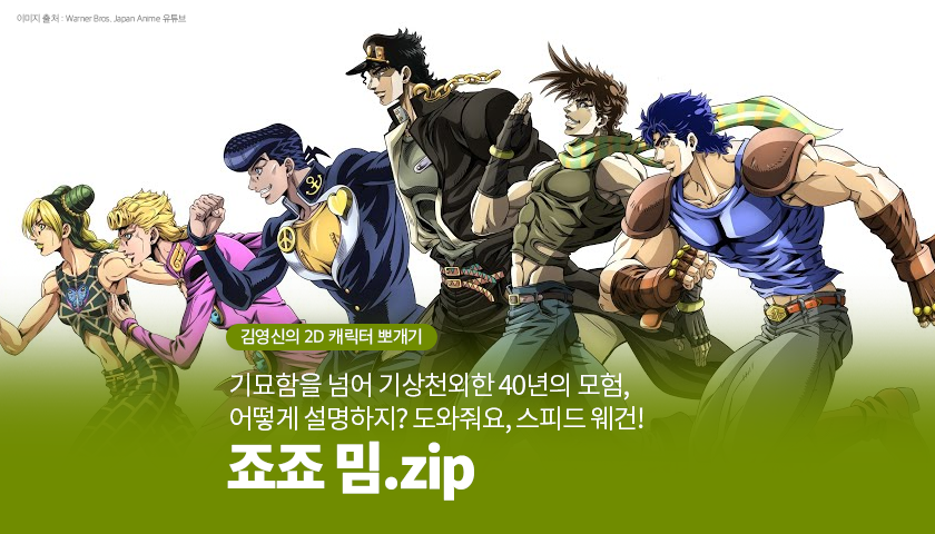 <죠죠의 기묘한 모험>을 어디서부터 설명해야 할까? 1987년부터 40년째 연재 중인 작품인데다, 1부부터 9부까지 다양한 등장인물이 만들어내는 명대사와 명장면이 너무나 많아. 아하, 이럴 땐 방법이 있지! 도와줘요, 스피드 웨건!