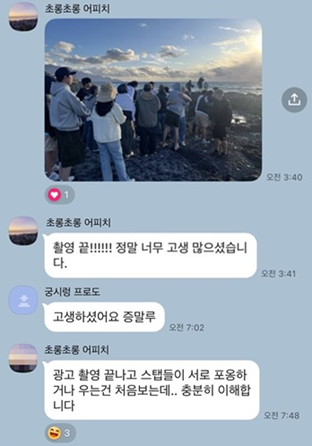 2주가 넘는 시간 동안의 동고동락 때문이었을까요? 마지막 촬영이 끝났을 다음날 한국 시각으로 새벽 3시 (현지 시각으로 아침 11시) NOL 단체 카톡방에 클라이언트가 이런 사진을 하나 올렸습니다.