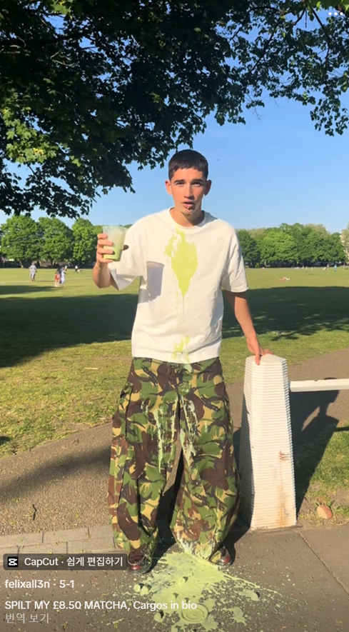 더불어 해외에서는 말차를 바닥이나 자신의 몸에 쏟아서 인증샷을 촬영하는 게 유행이었는데요. 아름답게 쏟은(?) 말차와 함께 자신의 아웃핏을 은은하게 자랑하기 위한 방법으로, 힙하다는 반응과 환경 파괴 및 음식 낭비라는 의견이 분분해요.