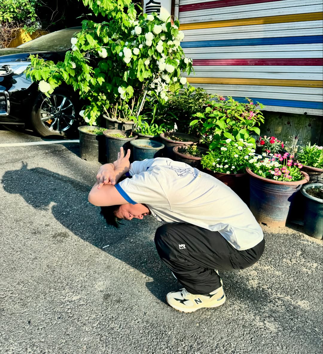 맞아요! 바로 팔의 위치예요! 츄와 유병재는 팔을 머리 뒤로 올려서 고양이의 귀와 수염을 만들었어요. 그림자를 만들기에 잘못된 자세는 아니지만, 고양이 그림자 챌린지의 올바른 자세는 팔을 머리 앞으로 두는 거예요. 팔을 머리 뒤로 두는 것보다 훨씬 쉽고, 편한 자세로 촬영이 가능해요.