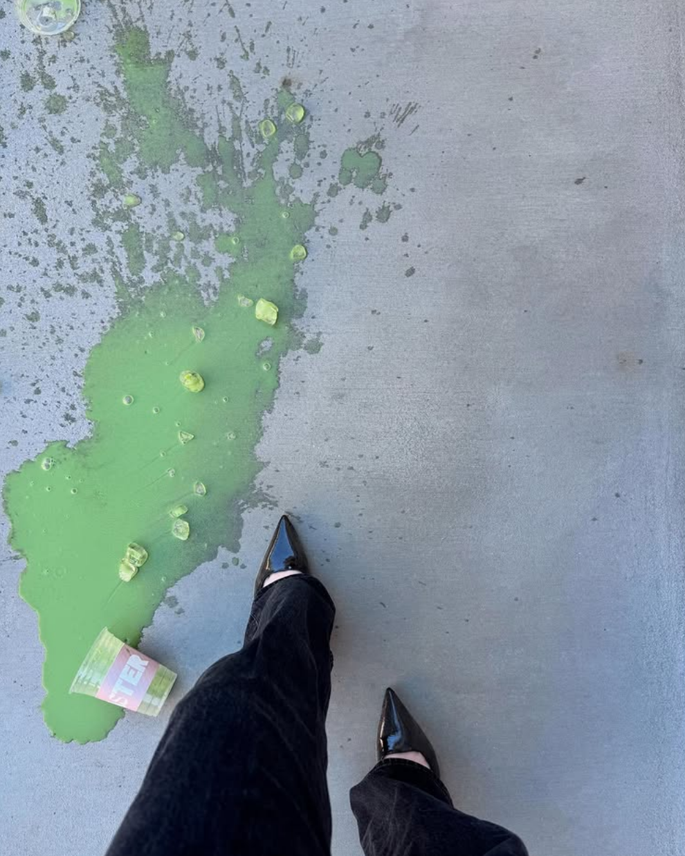 더불어 해외에서는 말차를 바닥이나 자신의 몸에 쏟아서 인증샷을 촬영하는 게 유행이었는데요. 아름답게 쏟은(?) 말차와 함께 자신의 아웃핏을 은은하게 자랑하기 위한 방법으로, 힙하다는 반응과 환경 파괴 및 음식 낭비라는 의견이 분분해요.